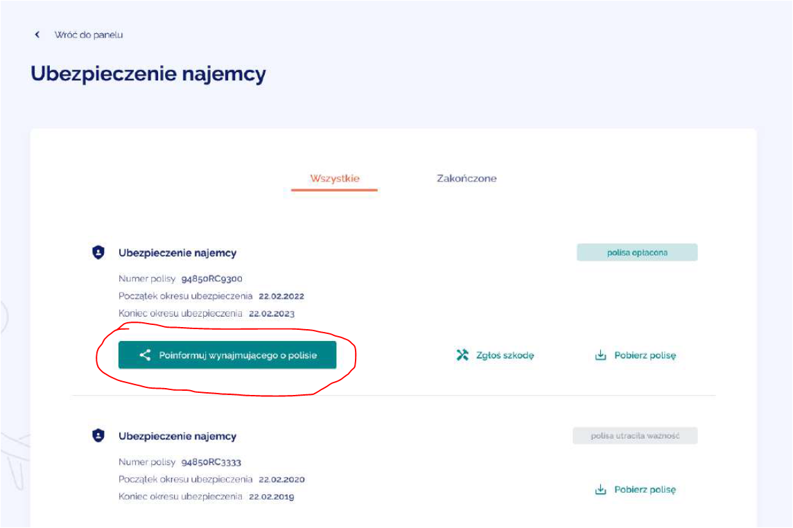 - Kliknij POINFORMUJ WYNAJMUJĄCEGO O POLISIE