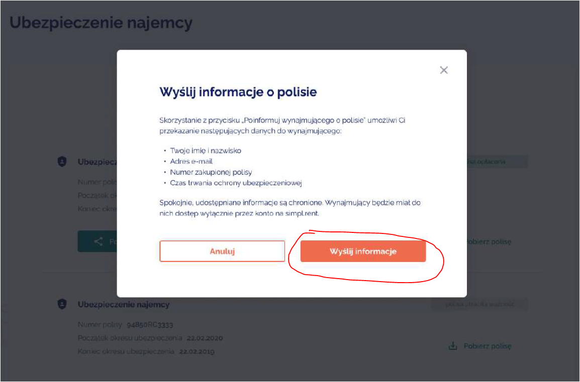 - Potwierdź chęć przekazania nam informacji o polisie klikając WYŚLIJ INFORMACJE
